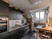 ...läche. Es befindet sich im 4. und letzten Stock eines historischen Gebäudes mit Aufzug, aufgeteilt in eine kleine Eigentumswohnung. Diese prächtige Wohnung, teilweise Dachgeschoss, verfügt über 1 großen Wohnbereich mit Kamineinsatz und offen zur Einb...